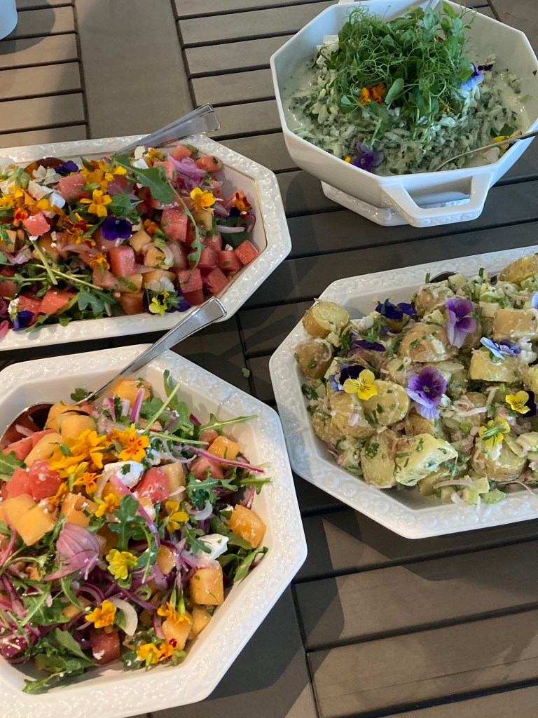 Hjemmelaget potetsalat med sjalottløk, eple og valnøtter, toppes med persille og vårløksalat